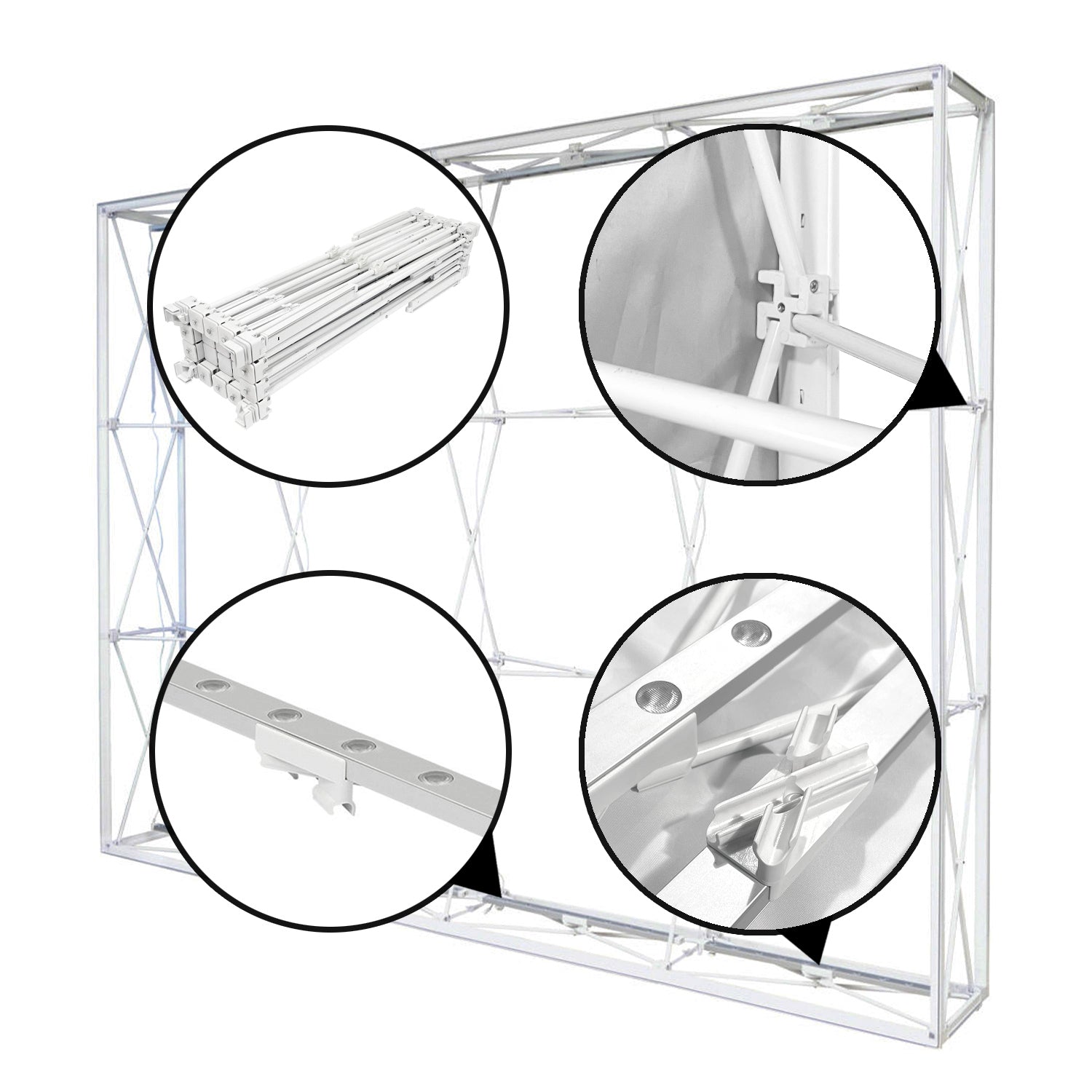 Our Popup hardware makes for quick and easy assembly at tradeshows, events and in-store marketing. The interior LED lights really plus up the backlit fabric prints, adding pop to this Popup display.
